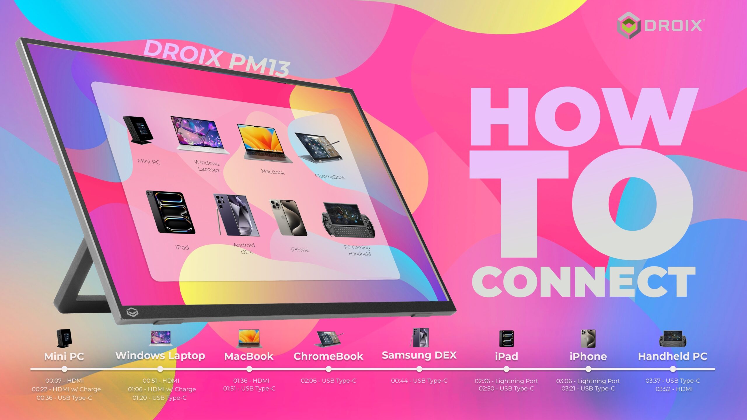 Various ways to connect the DroiX PM13 portable monitor include USB ActiveDP DisplayPort over USB Thunderbolt USB Ports and USB 4 Protocol for video output ensuring versatile connectivity