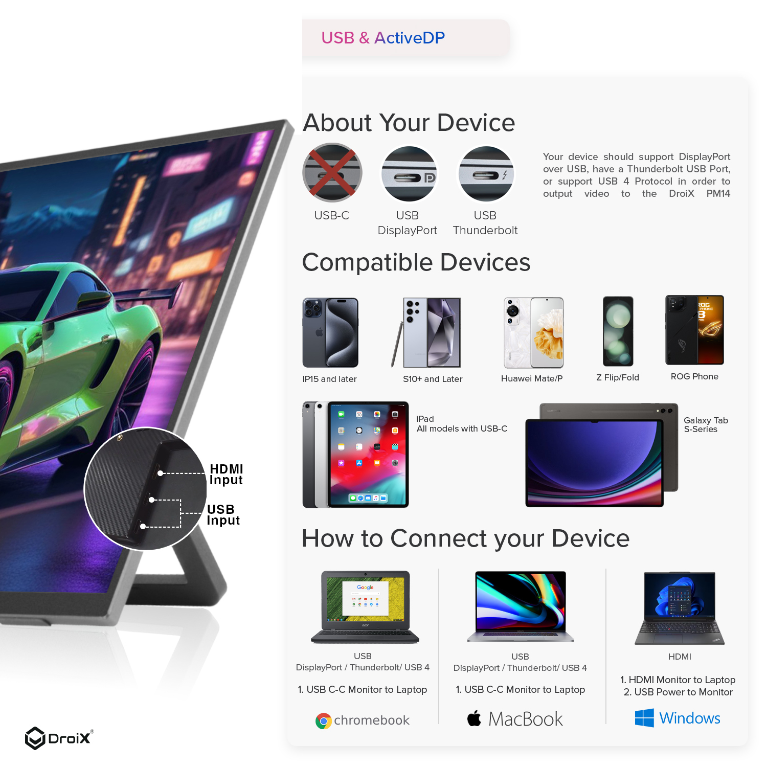 Discover the cutting-edge versatility of the DroiX PM13 portable monitor, designed to redefine compatibility and connectivity across a spectrum of devices. With its robust support for USB and ActiveDP technologies, this monitor effortlessly integrates with a diverse array of modern devices, from laptops to smartphones and beyond.