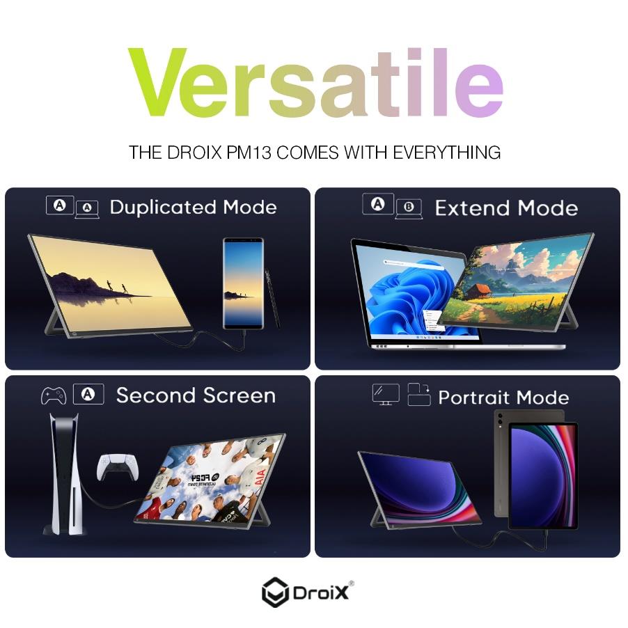 DroiX PM13 portable monitor exemplifies versatility with extensive compatibility and connectivity options It features four modes Duplicated Mode for mirroring content Extend Mode for expanding workspace Second Screen for gaming consoles and Portrait Mode for vertical orientation Ideal for professionals gamers and digital nomads enhancing productivity and entertainment in diverse environments