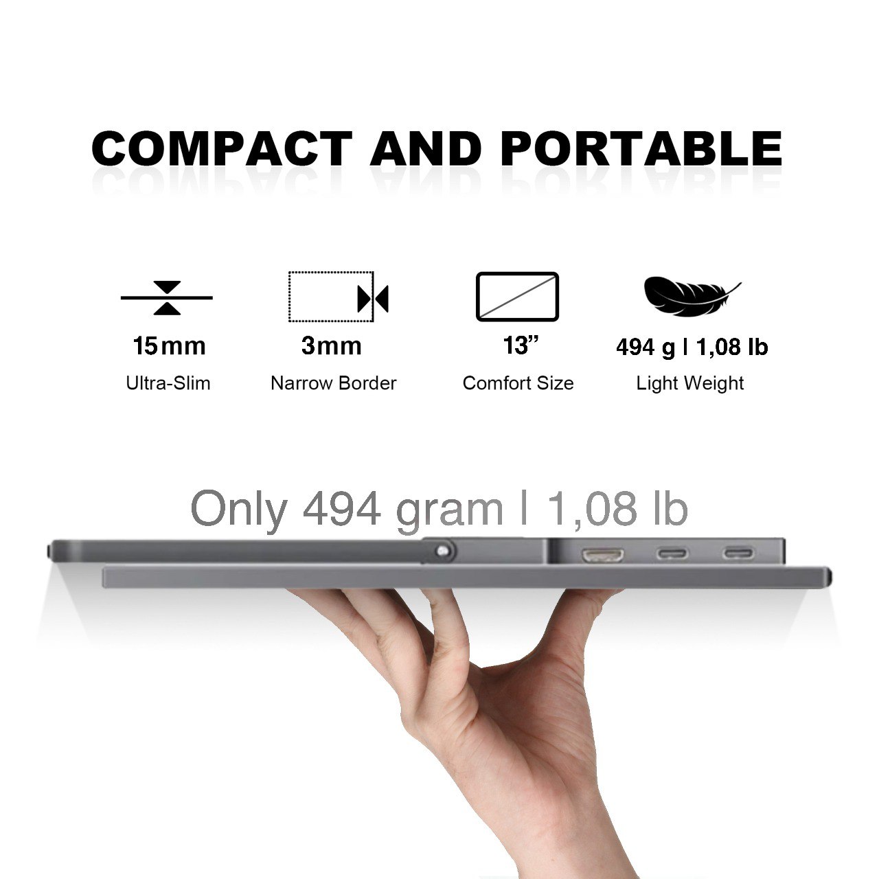 The DroiX PM13 is a sleek and lightweight 13″ 2K portable monitor, weighing just 494 grams. With its slim aluminium design and ultra-thin 0.11″ bezels, it combines elegance and portability. The IPS display delivers vibrant colors and wide 170-degree viewing angles, ensuring a rich visual experience. Compatible with a wide range of devices via HDMI and USB-C, the PM13 is the perfect versatile screen for enhancing your setup anywhere you go.