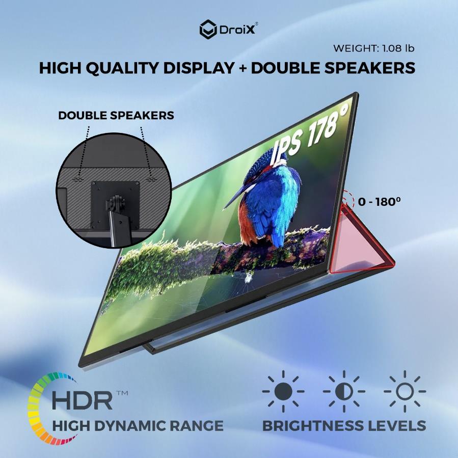 The DroiX PM13 portable monitor delivers a premium display experience with its impressive array of features. Its high brightness and HDR support guarantee clear visibility in any lighting condition, while the 100% sRGB coverage and 16.7 million colors provide the color accuracy essential for photo editing and graphic design. The 2K resolution on a 13-inch screen ensures a high pixel density, resulting in sharp and vibrant visuals for both text and multimedia content. This makes the PM13 an ideal choice for professionals and enthusiasts alike.