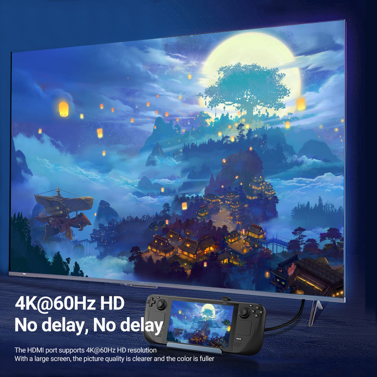 The Steam Deck 6-in-1 docking station provides stunning images via 4K 60Hz HDMI output for an immersive gaming experience. The USB-C PD 100W charger provides powerful performance to keep your devices charged for a long time. The dock features multiple ports, including Gigabit Ethernet and USB, so you can easily connect peripherals and maintain a stable network connection. The slim, portable, and compact design makes it perfect for playing at home or on the go.