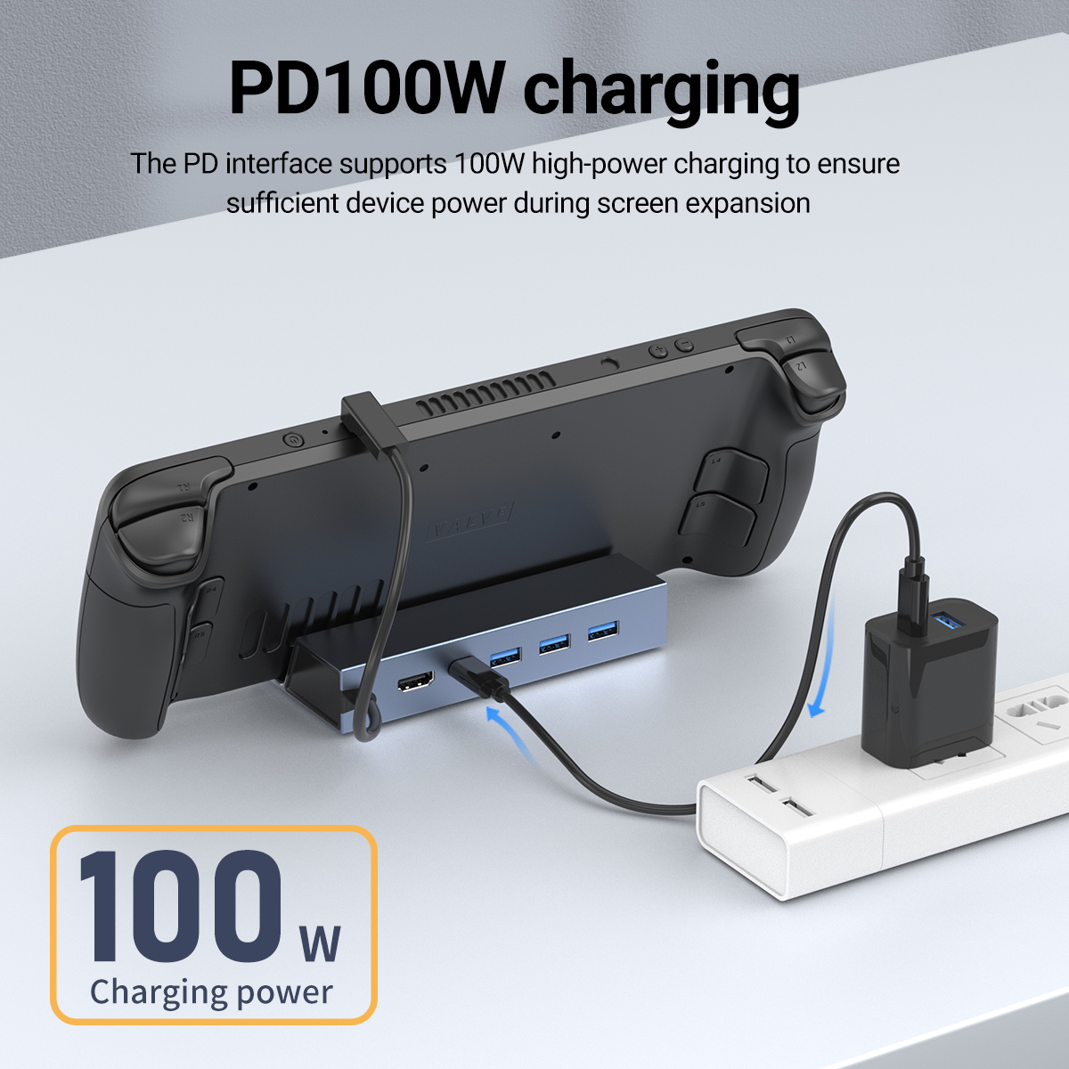 The 6-in-1 Docking Station for Valve Steam Deck offers powerful charging capabilities through its USB-C PD 100W port