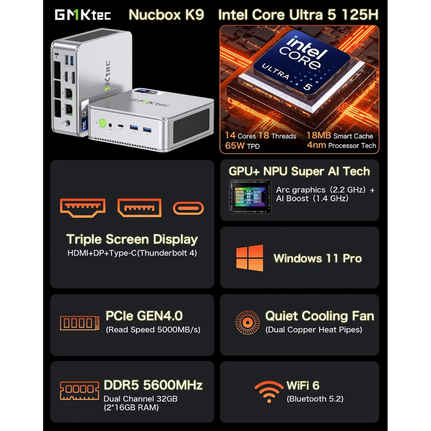 - Performance – The GMKTec NucBox K9 is powered by the Intel Core Ultra 125H, a 14-core, 18-thread processor built on a 4nm process. With a base clock speed of 3.6GHz and a maximum turbo boost of 4.5GHz, this mini PC for business handles demanding applications with ease. The CPU’s 18MB cache and configurable TDP of 28-65W ensure efficient power usage without sacrificing performance. The integrated Intel Arc graphics at 2.2GHz provide robust support for gaming and multimedia tasks, delivering stunning visuals and smooth playback.