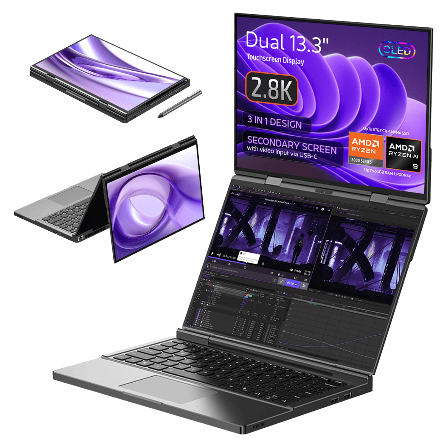 As an AI PC running Windows 11, the Duo leverages advanced AI capabilities for enhanced productivity and user experience. The synergy between Windows 11‘s AI features and the AMD Ryzen AI 9 HX 370 processor optimizes multitasking and supports AI-driven applications seamlessly. Take advantage of features like Snap Layouts and Widgets on the dual 13.3-inch OLED displays, enhancing workflow organization and keeping essential information accessible at all times.