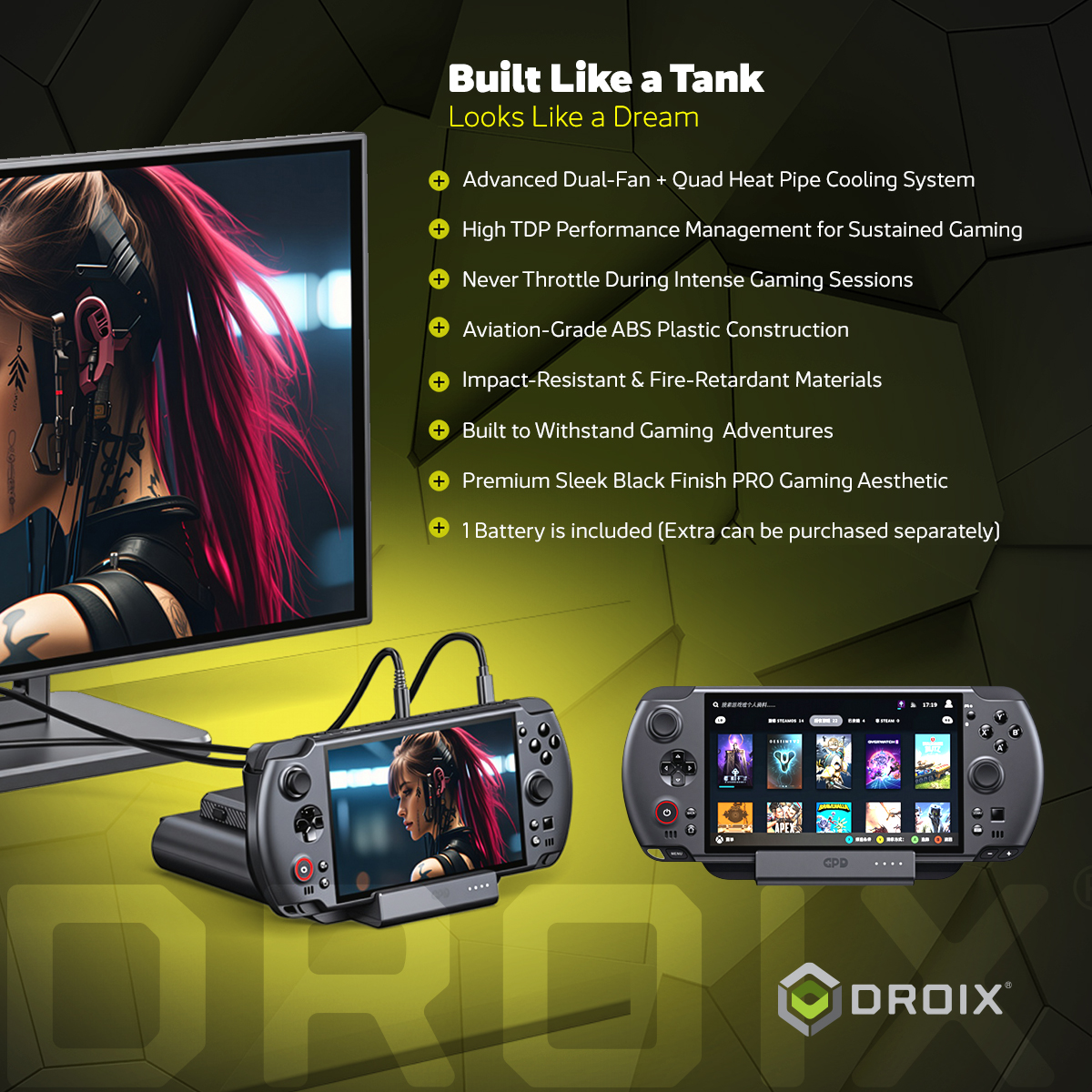To maintain peak performance, the WIN 5 uses GPD’s Frostwind Cooling Architecture, featuring dual second-generation PC-grade turbo fans and four superconducting copper-based composite heat pipes. This cooling system can handle up to 120W of instantaneous heat flux, ensuring consistent performance even during marathon gaming sessions.